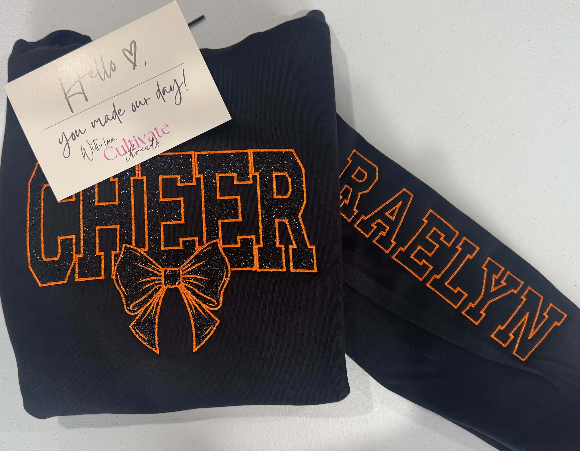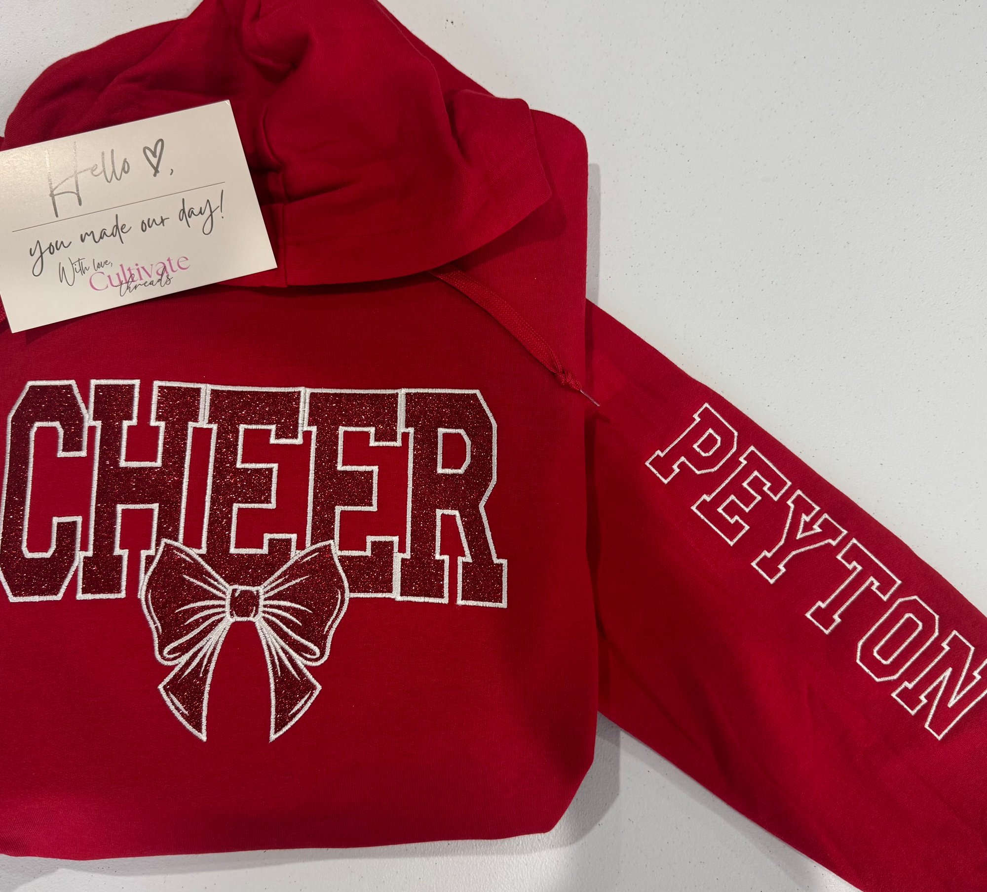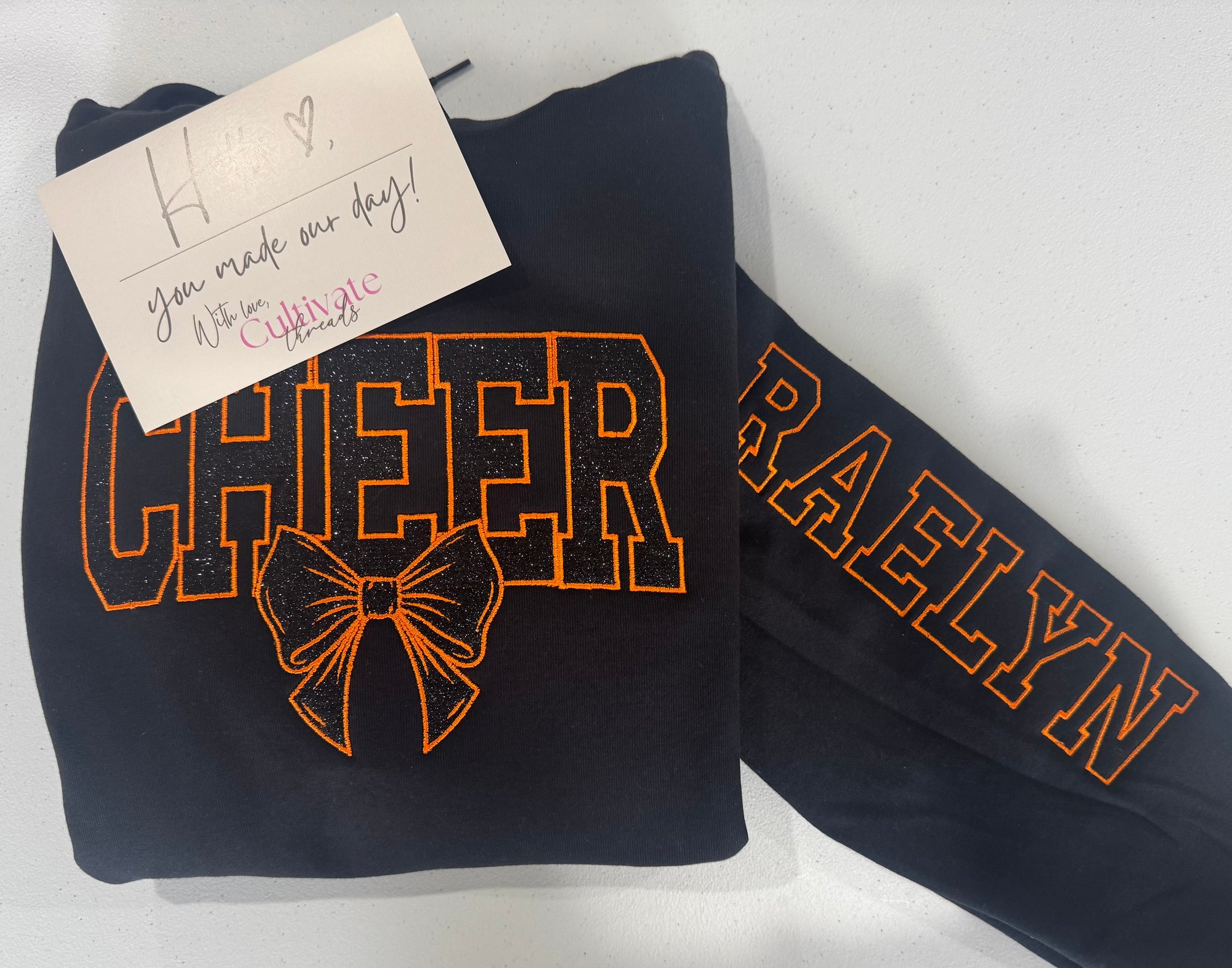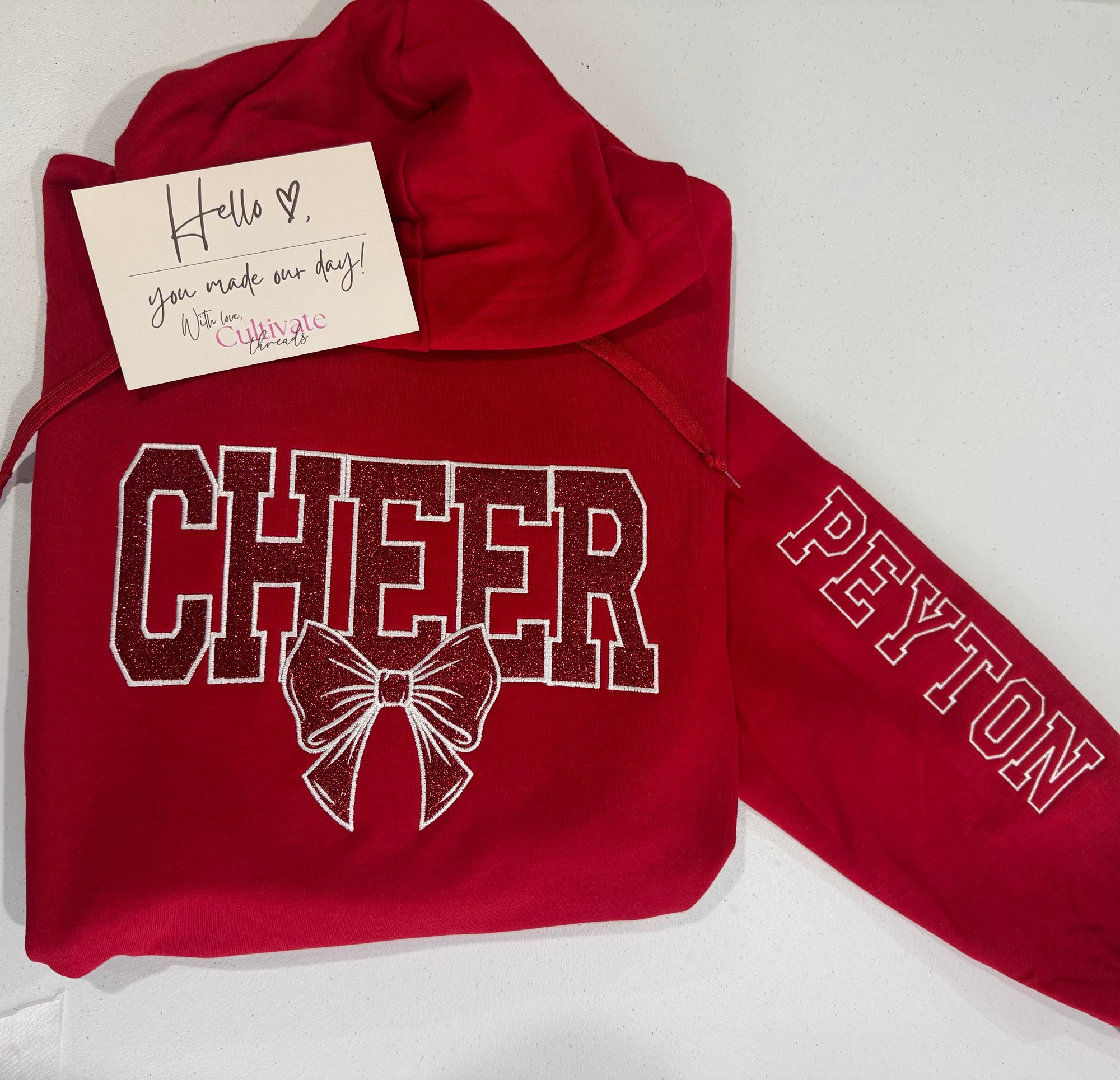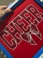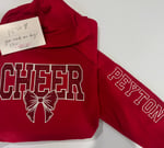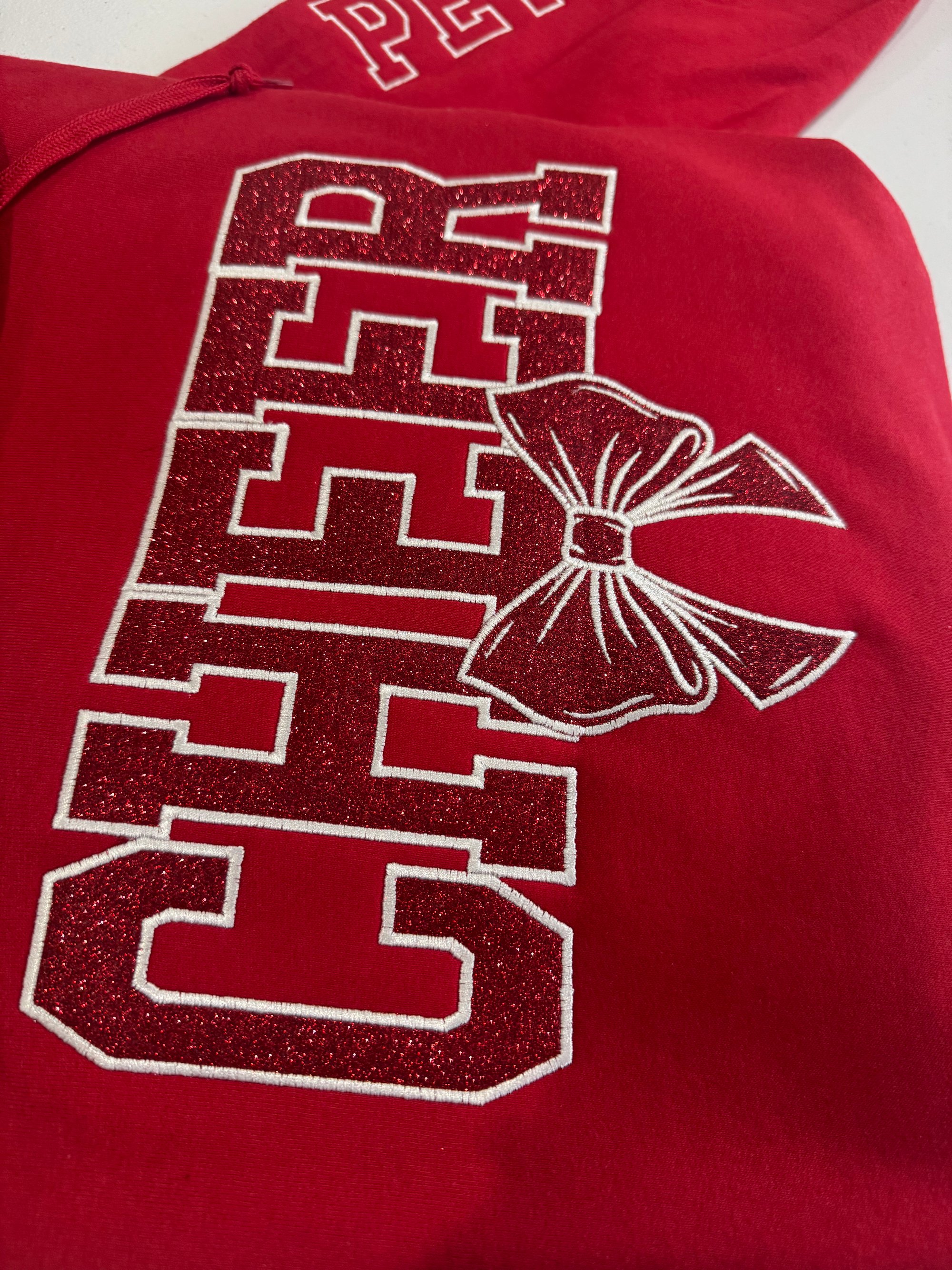Embroidered Glitter Cheer Mom sweatshirt on your choice of hoodie or crewneck, this includes one sleeve detail.