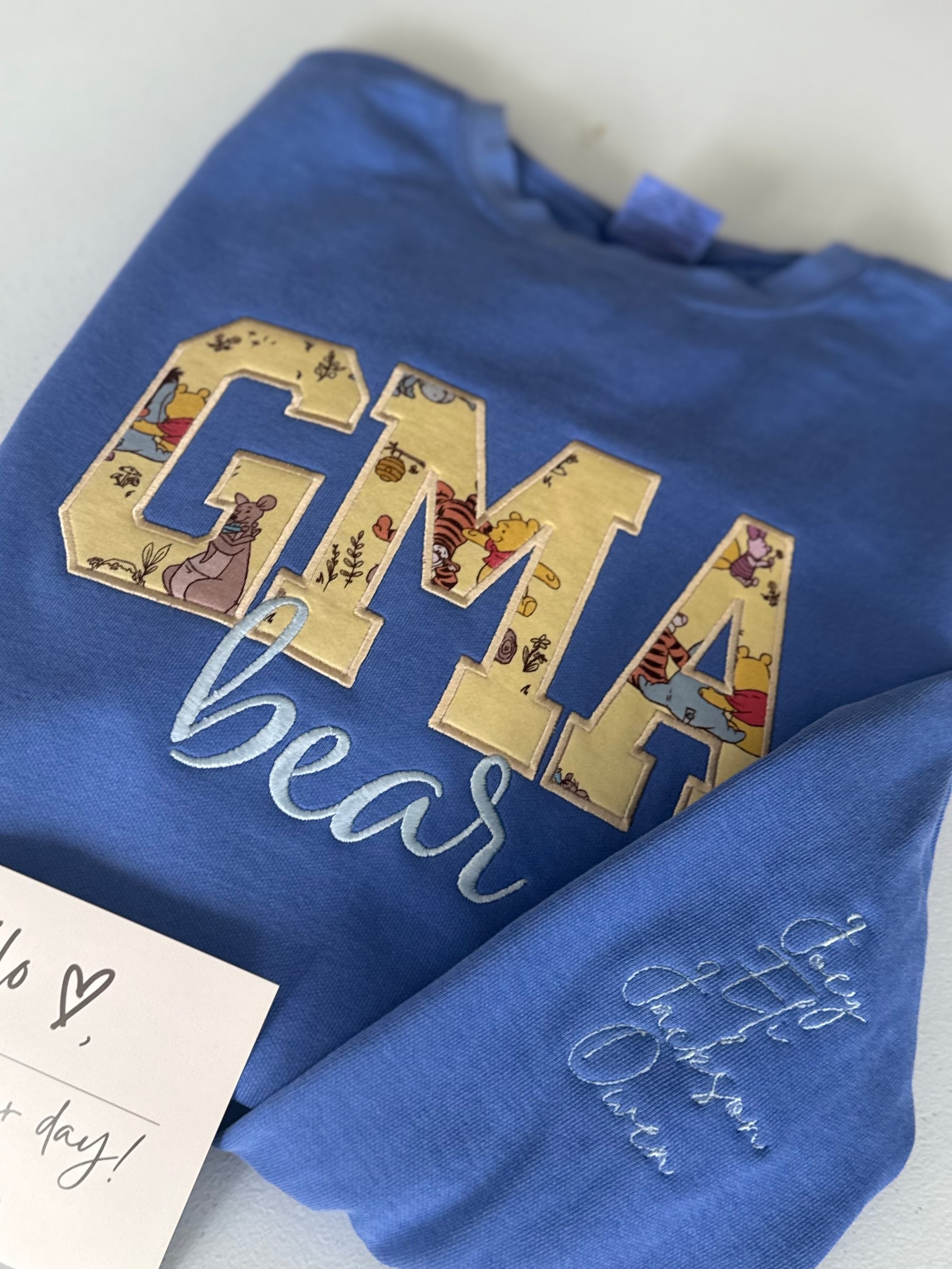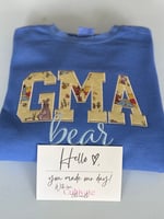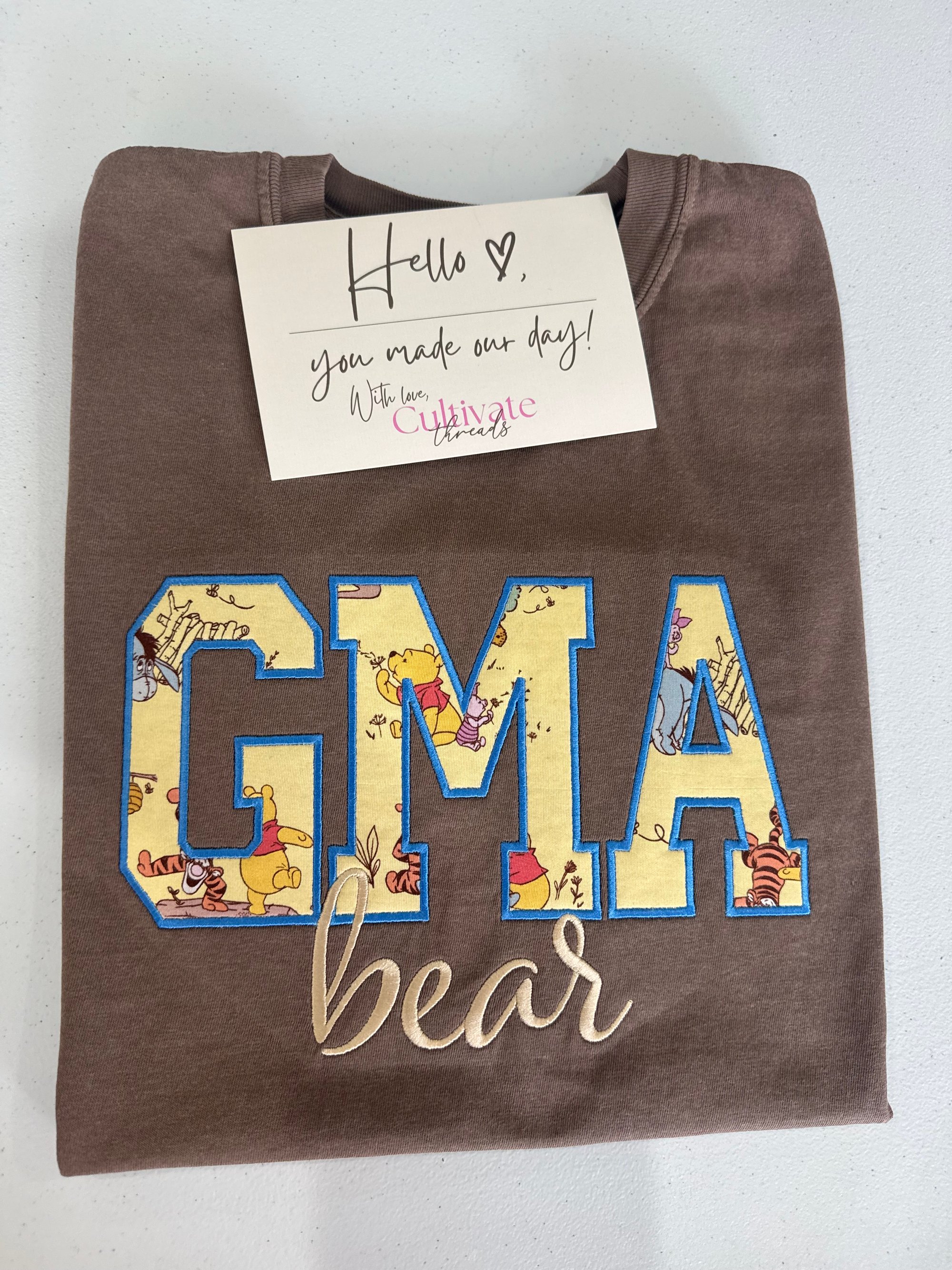 Your purchase will include up to 5 letters of appliqué on your choice of t-shirt or sweatshirt and your choice of fabric as well as thread color(s), This will also include one cursive word under the appliqué letters if you desire.