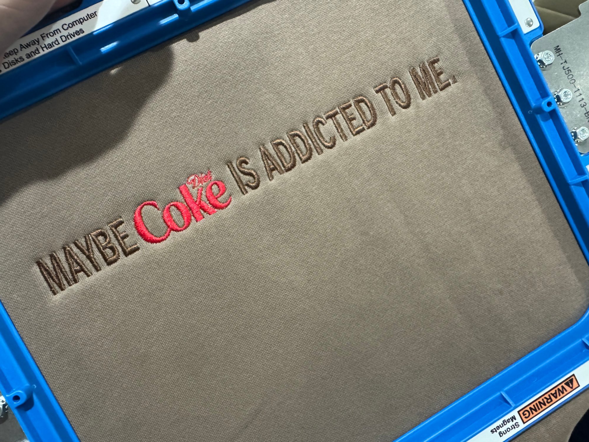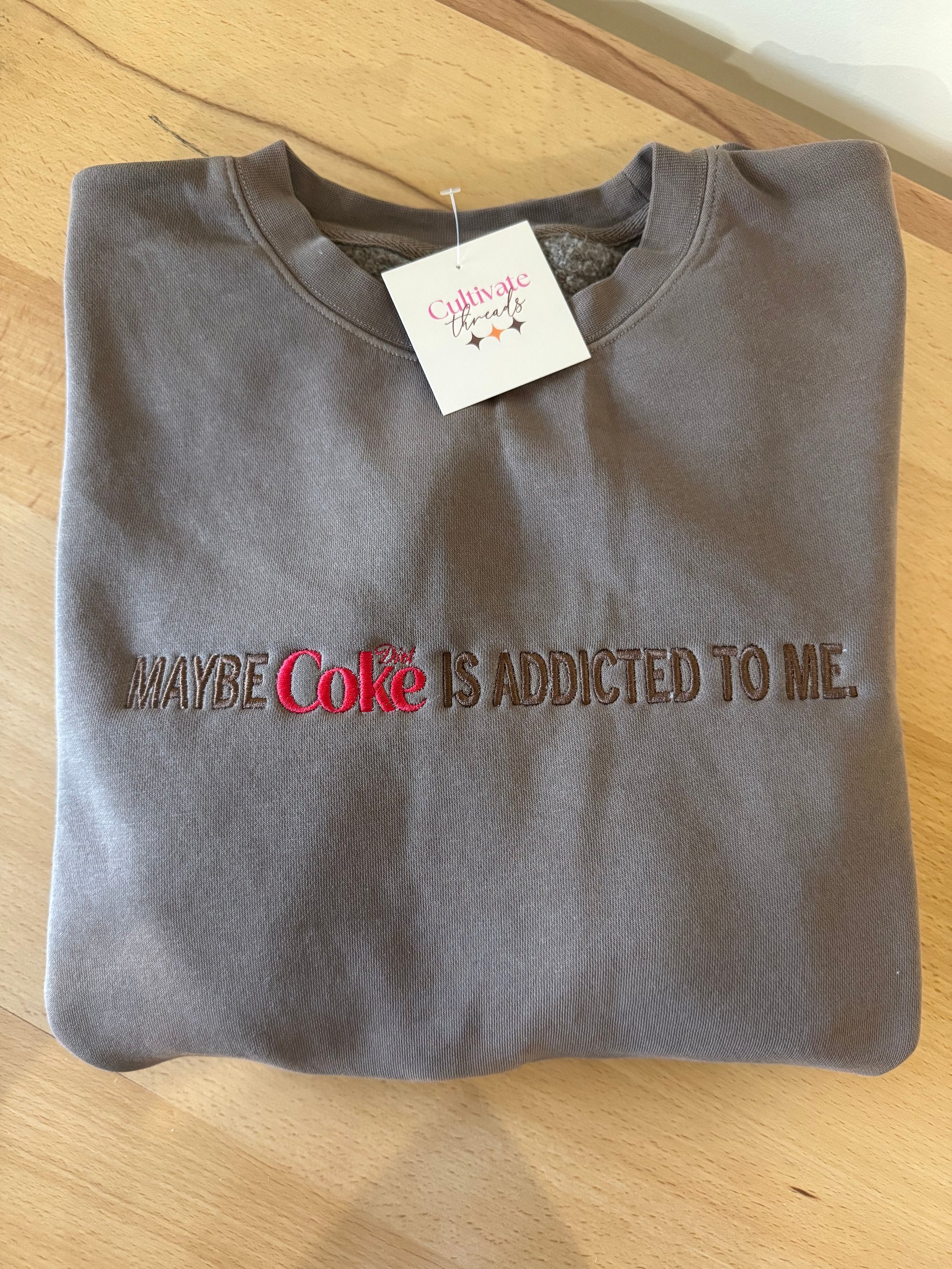 This is a brown crewneck sweatshirt, with brown embroidery thread and red Diet Coke embroidery thread.