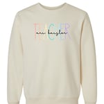 Celebrate your favorite educator in style with our Custom Multicolor “Teacher” Shirt — perfect for classrooms, casual days, or thoughtful gifts!Each shirt, sweatshirt, or hoodie features the word “Teacher” beautifully embroidered in a vibrant mix of colors, symbolizing creativity, inspiration, and the many hats teachers wear. What makes it extra special? Your teacher’s name is elegantly written through the word “Teacher,” creating a personalized, one-of-a-kind design.Product Details: